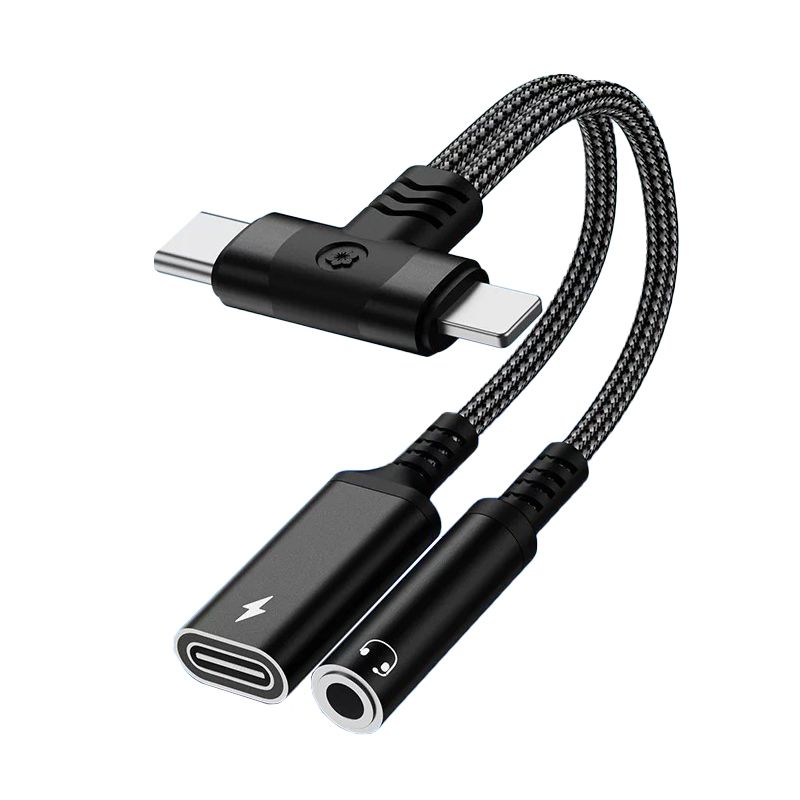 4 in 1 3.5mm AUX Audio Female and Charge USB C Female to Lighting Male and USB C Male (Black)(T-shaped)(0.3ft)
